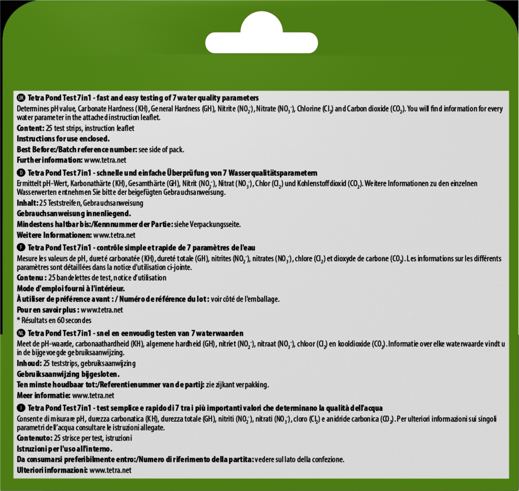Tetra Pond Test 7in1 umożliwia szybkie i wiarygodne określenie siedmiu najważniejszych parametrów wody w oczku wodnym w jednym prostym kroku. Ocenia poziom pH, carbonate hardness (KH), twardości węglanowej (KH), twardości ogólnej, azotynów (NO2-), azotanów (NO3-), chloru (Cl2) i dwutlenku węgla (CO2).