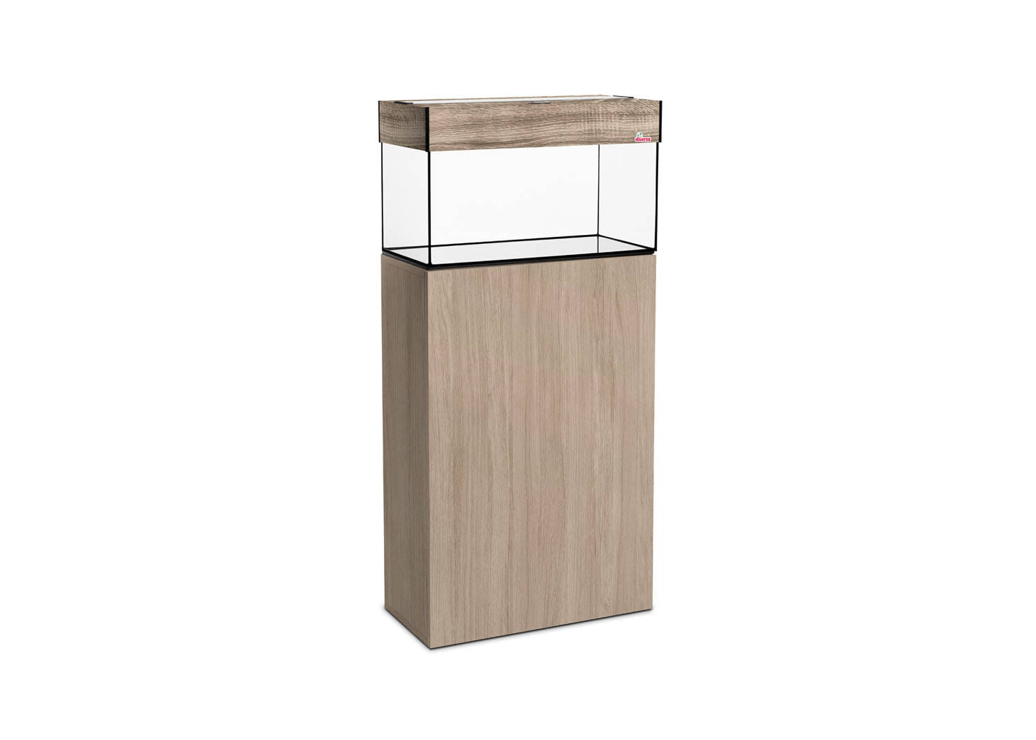 Szafka posiada krótszy blat dzięki czemu akwarium idealnie zachodzi nad drzwiczki, tworząc z nią równą bryłę. Taki zabieg zapewnia nowoczesny wygląd zestawu przy zachowaniu pełnego bezpieczeństwa użytkowania zbiornika.